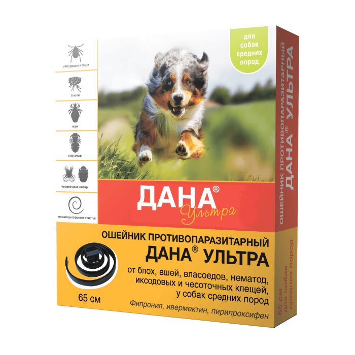 Anti-parasitic collar Dana Ultra is used in dogs and cats for the treatment and prevention of arachnoentomiasis caused by fleas, lice, lice-eaters, sarcoptoid, ixodid ticks, as well as for the prevention of ventricular otodectosis and nematodes.