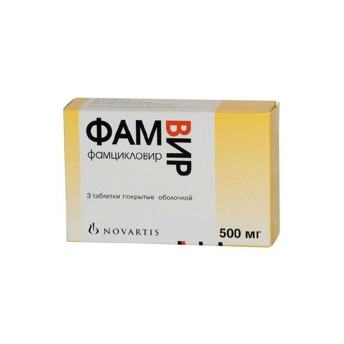 Famvir - an antiviral drug. After ingestion, famciclovir quickly turns into penciclovir, which is active against human herpes viruses, including Varicella zoster virus (herpes zoster virus) and Herpes simplex types 1 and 2 (herpes simplex and genital virus), as well as Epstein-Barr virus and cytomegalovirus.