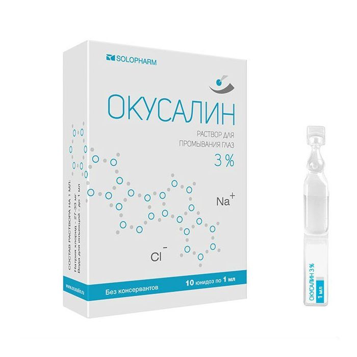 Okusalin is a sterile solution of sodium chloride (hypertonic solution of NaCl 3%).
